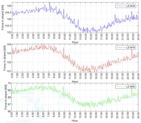 Table 7 shows the described calculation results for the three longest stay cables. Based on the graphs in Figure 9 and Figure 10, the range of the maximum and minimum force as well as the temperature changes were determined. Due to disturbances in the measurement caused by vehicle traffic, it was decided to present the extreme values as a value range. It is worth noting that between 10:00 and 11:00 a.m., there was a rapid temperature change by about 4 °C, which resulted with a force peak at the same time. As for the value, a similar force change occurred between 0:00 and 6:00 a.m. by the temperature difference of 3.7 °C.