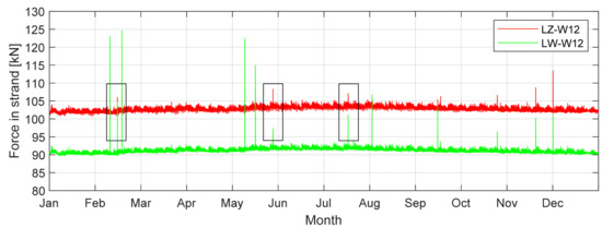 Force diagram in the middle-length cables LZ-W12 and LW-W12 with selected maximum force peaks in 2017.