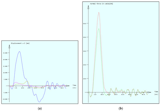 (a) Node displacements for 3 measuring points on one span, magenta line: deck point under the longest cables W40, dark blue line: deck point under the medium–long cables W32, brown line: deck point under the shortest cables W21; (b) tension force in the whole cables W12, red line: outer deck cable, green line: inner deck cable.