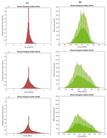 Figure 17a shows these histograms for the discussed cables. Ranges from −5 to 5 MPa were defined in order to improve their readability. By examining the entire stress spectra, stress changes of up to 60 MPa appear in them. Figure 17b presents the histograms of stresses in the analysed cables without separating thermal influences and dead weight. The dissipation of stress values over a year is visibly larger due to the influence of temperature on the tension force in the cable.