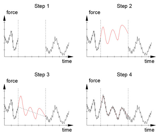 Data simulation scheme. Step 1: no data; step 2: simulating the average course of forces on the following days on the basis of a randomly selected Fourier series from the created database; step 3: linear data fit correction; step 4: simulation of amplitudes using the inverse distribution function.