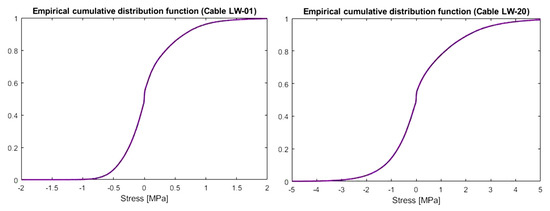 Empirical cumulative distributions for stress changes in the shortest (LW-01) and longest cable (LW-20).