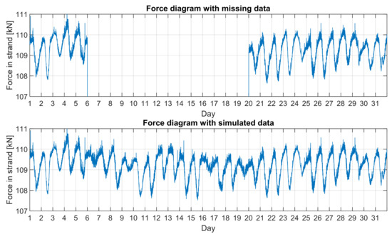 A frequent problem of large monitoring systems are their temporary failures related to electricity supply, etc. This may result in longer or shorter periods related to the lack of measured data. To do this, in order to keep the overview, the data should be properly simulated. The advantage of long-term SHM measurements is that their database is constantly growing. The histograms and graphs created above show how data can be divided and sorted. In such a prepared form, they can be used to simulate consecutive or missing data. Figure 19 shows the idea of such a simulation scheme.