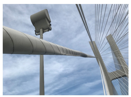 An alternative method that can be used for the determination of a stay cable force are dynamic measurements by using, e.g., external accelerometers. The potential of this method is a subject of the Polish–Portuguese NAWA-FCT research project “Dynamic monitoring of bridge structures”, supported by the Polish National Agency for Academic Exchange and Fundação para a Ciência e a Tecnologia in Portugal, that is carried out, among others, on the Rędziński Bridge (Figure 23). Dynamic measurements indicate the wide applicability, easiness and practicality to validate the design assumptions of bridges and assess the condition of their stay cable systems [9,14]. This method can support the SHM system and the FEM model-based force analysis. It will be used as the future research direction on the Rędziński Bridge.