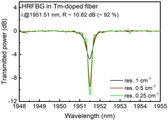 Initial measurements were performed using a single HRFBG in order to estimate the effective length of the laser cavity. The HRFBG was a fourth order grating, inscribed with a period Λ = ~2.2 μm and 3000 periods, which resulted in a grating length of ~6.6 mm. The grating was characterized using an in-house build broadband light source [44] with an output power exceeding 100 mW and spectral range 1700–2050 nm. The output spectra were monitored with an FTIR spectrometer with a minimum spatial resolution of 0.25 cm−1, which is equivalent to ~325 pm. The resonance Bragg wavelength was found at 1951.5 nm, with an estimated strength exceeding 10 dB (~92% reflectivity) and a grating FWHM bandwidth of ~150 pm; the transmission spectrum is shown in Figure 1.