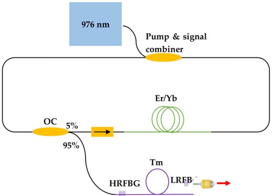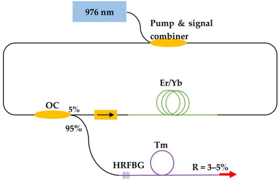 Schematic diagram of the experimental setup used to characterize the fiber laser (OC: optical coupler; Er/Yb: Erbium and Ytterbium doped fiber; Tm: Thulium doped fiber; HRFBG: High reflectivity FBG; R: reflection).
