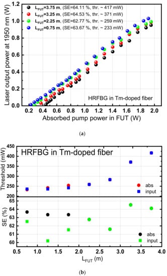 (a) Slope efficiency (SE) characterization results for different lengths (LFUT), for HRFBG, (b) threshold (upper) and SE in terms of length respective to the input and absorbed (abs) pump power at 1565 nm. (FUT: fiber under test).