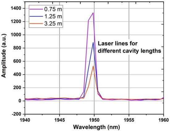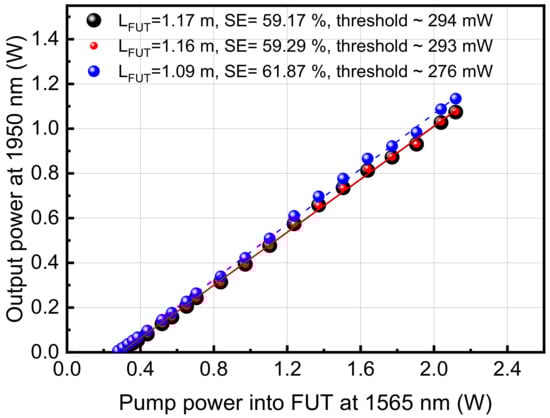 The characterization results of the three monolithic fiber lasers, as performed using the configuration shown in Figure 6, are very similar (Figure 7). The SE varies from 59.17% to 59.29% for the FL strands with cavity length 1.17 and 1.16 m, respectively, and 61.87% for the shortest cavity length of 1.09 m. The threshold power was 294 mW for the 1.17 m cavity length and decreased to 276 mW for the 1.09 m cavity. Comparing the results with measurements using a single HRFBG, a small SE drop of ~4% was noted and an increase in threshold power, which is expected since the LRFBG induced some additional loss in the laser cavity and any remaining active fiber after the LRFBG absorbed light at 1950 nm. Typical laser spectra are shown in Figure 8, where a laser line at 1950 nm was determined by the FBGs. It is important to note that the output end was terminated with angle-polished (APC) pigtail in order to remove the back reflections from the end of the fiber and their contribution into the laser cavity [46,47]. There is no observable wavelength shift of the laser with increasing pump powers, within the measurement resolution limitations.