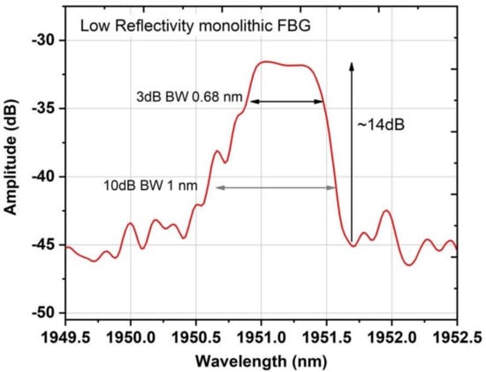 where is refractive index change averaged over a grating period, v is the fringe visibility of the index change (1 is this case), neff is the effective refractive index, and L is the length of the grating. Hence, fourth-order LRFBGs inscribed with N = 100 and total grating length ~200 μm resulted in a FWHM bandwidth of ~0.68 nm and 1 nm bandwidth at the 10 dB point (Figure 5). By controlling the bandwidth of the weak reflector (LRFBG), mismatching issues between the FBGs are avoided. However, due to the low reflectivity of the short-length LRFBGs, it was not possible to characterize their spectra in transmission with the available equipment but in reflection, as shown in Figure 5, using an optical circulator, an NKT Photonics (Birkerød, Denmark) supercontinuum source and a Yokogawa AQ6375B optical spectrum analyzer.