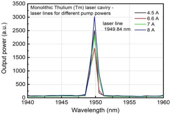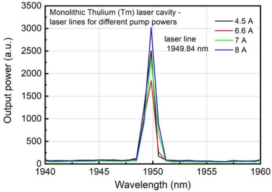 The wavelength stability of fiber lasers developed using FBGs, depends upon two factors: (i) the fiber temperature, which increases as the pump power increases, and (ii) nonlinear effects, such as the population inversion of the Tm fiber. As reported in a previous study, a wavelength shift of 1.41 pm/mW was anticipated [36], as measured using a fiber with similar content of Tm and Al-dopant as utilized in this work, but for FBGs inscribed using a phase mask [8]. With respect to this value, the proposed monolithic FL cavities should have displayed a wavelength shift of >2.8 nm, since the lasers were pumped beyond 2 W. However, no such wavelength shift was observed, and indeed would be detectable using the available equipment (1 nm resolution). Hence, the anticipated wavelength shift was significantly lower than that reported in [36]. A possible reason could relate to the phase mask FBG inscription, where the whole area of the core and partially the cladding is modified, increasing absorption and loss.