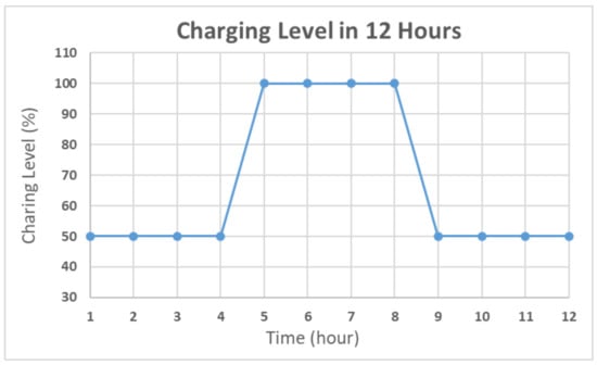To simulate the algorithm, the charging time was assumed to be 12 h. During the charging time, the charging level was set to 100% for 4 h, and 50% otherwise. The detailed distribution is shown in Figure 5. The other 12 h shows a 0% charging level for simulating the night. The battery level was set to 100% and the period was set to 10 s as the default. In the proposed simulation, the charging efficiency was assumed as ideal and simple for simulating the power optimizing process efficiency. In Figure 5, the solar duration was set to 12 h. The charging level was set to 100% for midday simulation and 50% for early morning and evening simulation. During the charging time, the charging level was set to 100% for 4 h and 50% for 8 h. The simulation showed that the average charging efficiency was 66.67%. The lowest power consumption of the device was 125 mA. Thus, the average efficient charging current was computed to be 131.68 mA. To set the safety level, the charging time was assumed as 6 h, half of the total charging duration. For a battery with 3000 mAh capacity, a 6 h charging with 131.68 mA could increase the battery level to about 26%. Taking the tolerance into consideration, the safety level was set to 80% in deciding when to use the multi-step measurement. The simulation results of the power self-optimizing process are shown in Figure 6, illustrating the charging level, battery level, and system current over time. The charging level was assumed to be 100% for 4 h, and 50% for 8 h for simulating the daytime. At night, the charging level was 0% for 12 h. The battery level was the system battery current capacity at each hour. According to the charging level, the power optimizing process has a tradeoff between the accuracy and system power consumption. For example, if the battery level is low and charging level is lower than the safety level, the process decreases system power by reducing the moving time of the sensor. The motor startup current is about 2.5 times the operation current, but it only happens for a moment. The startup current affects the system power but it has less effect by considering the sensor moving time of the multi-step measurement. In this implementation, the moving time was about 10 s. With an assumption of 0.1 s for the motor start up, the motor power was about 137.03 mA. For the first 15 h, the charging current could supply the whole system current requirement. The battery level stayed at 100%, and the multi-step measurement worked in its lowest period. After 12 h, the charging level decreased to 0. The battery level was drained without any charging current and the period was increasing to reduce the system power consumption. When the battery level was 80%, the multi-step measurement function was turned off to make the system operation in its lowest power consumption level at the 18th hour. At the 25th hour, the battery of the device started to get charged. The battery level increased gradually until it was 80% charged at the 32th hour to turn on the multi-step measurement. After which, the battery level changed between 50% to 100% due to the continuous power consumption and charging efficiency. By using this method, the multi-step measurement operated for 47.5% of the total simulation time, and the battery level was maintained at greater or equal to 50%. To compare with static operation, the simulation of the proposed method for a fixed period of 30 s is shown in Figure 7, with the battery level efficiently kept at 45%. However, the proposed method can also maintain its operation at 50% battery level. Thus, dynamically tuning the period can conserve the battery level, and keep it at a higher level. The efficiency of power is improved through the power self-optimizing process.