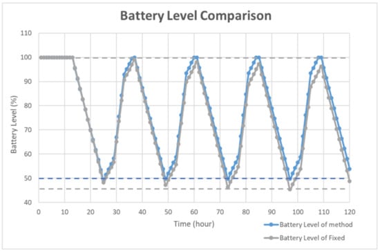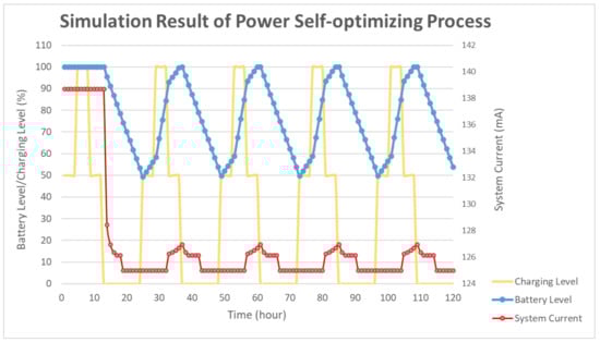 To realize the method, the period of computation of the power self-optimizing algorithm is shown in the pseudocode below. The Algorithm 1 inputs include the battery level and charging current, and its output is the transmission period. The settings of the process include the default period, increasing level and decreasing level of period, maximum period, multi-step measurement operation time, and safety level. In the beginning, the next state is determined by the battery level. If the battery level is lower than the safety level, the proposed multi-step measurement function will be turned off to lower the power consumption. On the contrary, the proposed multi-step measurement function will be turned on to improve the accuracy. The total current of the system is calculated using Equation (6) for comparison with the charging power using Equation (2). The parameter q decides on adjusting the transmission time for the next operation period. Finally, in the next state, the charging current and total current are considered to decide on increasing or decreasing the period. If the multi-step measurement function is active, the period will increase to improve the power consumption, or decrease to improve the accuracy. As for the increasing period, the configuration of the maximum period, MaxPeriod, varies for different applications. In this simulation the maximum period is 120, for the longest estimated interval of 120 s. On the other hand, for the decreasing period, the limitation of the lowest period depends on the operating time of the multi-step measurement. With 5 cm and 5 times multi-step setups, the operation cost is about 10 s. As such, the multi-step operating time is 10 s for this simulation.