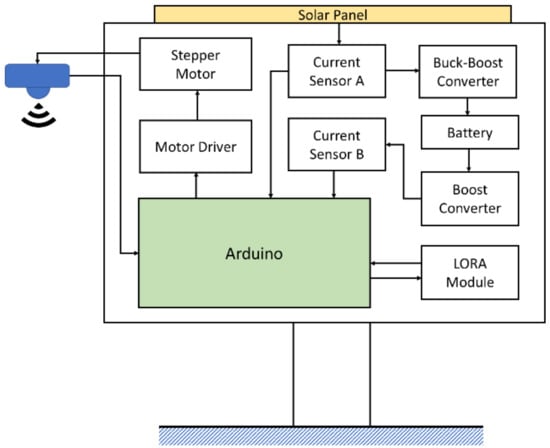 To improve on the power efficiency and accuracy, a multi-step measurement mechanism and power self-optimizing process are proposed in this paper. To implement the methodology, the system was built and designed for a water level sensing application. The system was composed of a solar panel, two buck converters, a battery, a LORA module, two current sensors, a stepper motor, a stepper motor driver, and an Arduino Nano as the control unit, as illustrated and shown in Figure 8 and Figure 9. For driving the stepper motor, the Arduino will send the control signal to the driver, then the ultrasonic sensor can move with the stepper motor and feedback the sensing data. In an accuracy state, the Arduino handles the raw data to acquire an estimated result. The LORA module transmits the estimated data to the backend whether in an accuracy state or in a normal state. In order to increase the efficiency of the device lifetime, a solar panel was designed and incorporated in the system to enable self-charging. When the solar panel transforms the solar energy to current, the current sensor A will detect the current to acquire the charging level. To transform the current to its charging level, the Arduino will calculate the current by converting the loss of 10%. To power up the Arduino, the battery discharging voltage needs to convert 5 V through another converter. The battery level impacts the power self-optimizing process. With that, the current sensor B estimates the current from the battery to acquire the battery level. The system was successfully designed and tested to measure the water level. The whole system was realized, with its circuit board and components illustrated in Figure 9. To acquire actual data, the setup of the multi-step measurement was moved at 3 cm five times, and moved at 5 cm five times. For multi-step measurement, the sensor starts at an initial location which is fixed. The motor will roll up the entire wire at each measurement to make sure that the initial location is in a consistent value every time. When the device turns to accuracy mode, MCU will send the information of direction and number of rotations to control the motor. The sensor will move a fixed distance according to a fixed number of rotations. Using the ultrasonic sensor module GY-US42V2, the estimated results are listed in Table 6. There were four different estimated distances used to test the efficiency of the multi-step measurement method. Referring to Table 6, the first row lists the estimated distance of 50 cm, the ultrasonic sensor estimated distance at the initial location of 50 cm. Then, the sensor was moved down by 3 cm using the proposed multi-step measurement to record the estimated water level and repeated 5 times. The recorded lowest estimated distance was 35 cm. To get the total measurement, the measurement was repeated 10 times and the average distance was computed for the different estimated distances. To estimate the efficiency of the multi-step measurement, the result using the single-step measurement was considered as the estimated data at the initial location, while the result using the multi-step measurement was considered as the estimated data processed using Equation (1). Results show that the highest efficiency was 0.39% at 200 cm, and the lowest efficiency was 0.16% at 50 cm. The proposed multi-step measurement was successfully implemented in hardware. Results show that it was able to efficiently improve the accuracy from the actual measurements acquired.
