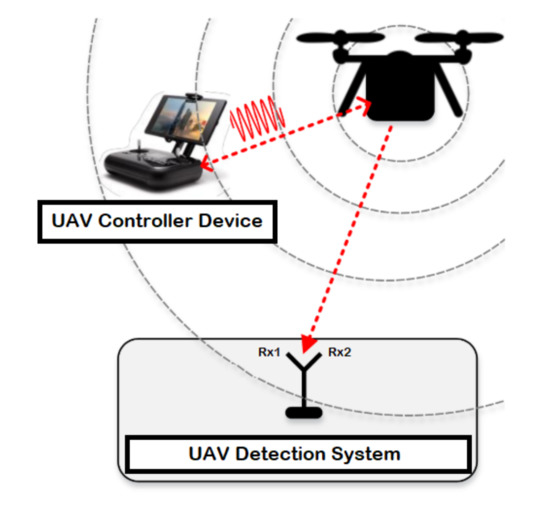 UAVs typically include on-board transmitters to control and run the UAV using only the RF signal, which are used in the communication between the UAV and the controller for data exchange purposes. These transmitter is generally works based on the 2.4 GHz Industrial, Scientific, and Medical (ISM) band. UAVs can be observed and identified from a long distance based on both the UAV itself and the characteristic of the used receiver about the surrounding environment. In addition to the benefit of employing RF signal to detect the UAVs, the used controller to transmit the signal might also be located to allow human to locate and identify the source signal.