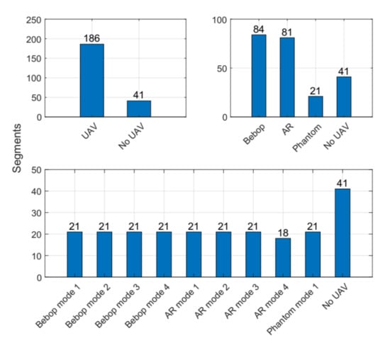 In order to prevent memory overload, the collected RF-signals were stored as segments in a CSV-format, based on the authors in Reference [34]. This makes loading and interpreting of the RF-UAV dataset using any compatible application simple and even easier than other formats. Figure 2 shows in details the recorded segments for each experimental level in the RF-UAV dataset. The dataset contains in total 227 segments, and each segment consists of 20 million samples; hence, this makes the dataset in range of a huge dataset. This dataset has been used in previous research studies [26,28,32], and the distribution of samples for all cases is as follows: