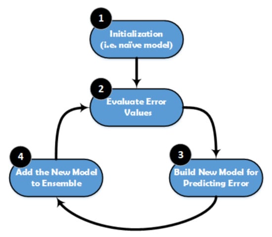 XGBoost is a popular implementation of gradient boosting, and it works based on the Gradient Boosted Decision Tree model. The main steps of XGBoost method are illustrated in Figure 5. This model is initialized by using a simple base prediction, which handles the initialization of the first predictions. After that, it starts evaluating the error values for each sample in the dataset. Next, a new model is built to predict the samples based on the error values. The output predictions from the new model will be added to the ensemble of models. To predict any sample, we need to add all the predictions from the previous models and then use them to evaluate the new error value, construct a new model, and add it to the ensemble of models and so on. Some important characteristics can be achieved by using XGBoost method, especially when the dataset is large, such as regularization, cache awareness, parallel learning, and less number of splits in the trees, and the overfitting can be avoided by using a suitable stopping method for the boosting, and it has a positive impact on the out-of-core computing.