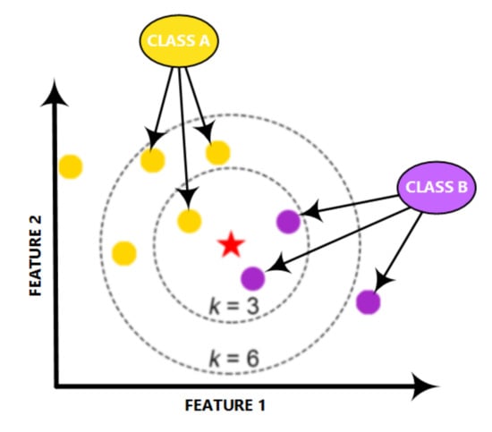 The KNN is a powerful classifier; it is said that, for a specific value of K, the KNN algorithm finds the K nearest neighbors for a given data sample, and, next, it specifies the applicable class to this sample by choosing a class which achieves the highest number of samples out of all other classes of K neighbors, as illustrated in Figure 6.