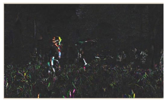 This information indicates changes in the video sequence motion over time. A greater value indicates a higher sequence motion. From a technical point of view, TI is based on the function of movement difference. This feature is a difference between pixel values at the same place in the space in the successive frames of the video (see in Figure 3). This information determines differences in the movement of the frames or consecutive times, which defines the function (n) in Equation (2):
