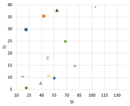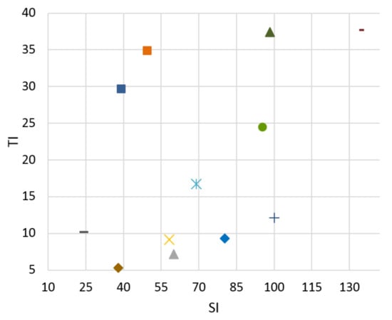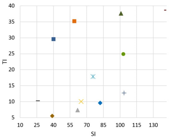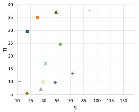 Spatial and temporal information were used for identification of the video sequences. These values classify the video content of each scene in our database, and to have a different rate for each video sequence encoded to a different resolution, bitrate, or compression standard. Numerous types of video sequences with different SI and TI were adopted. We complied with the ITU’s recommendations [,] for conducting subjective tests. The MOS scale was applied for subjective video evaluation. Generally, spatial and temporal information is used to represent video content. This information is the critical and key variable of a given scene and determines the compression rate of the video. The content classification was analyzed by computing the SI and TI indices for each video sequence.