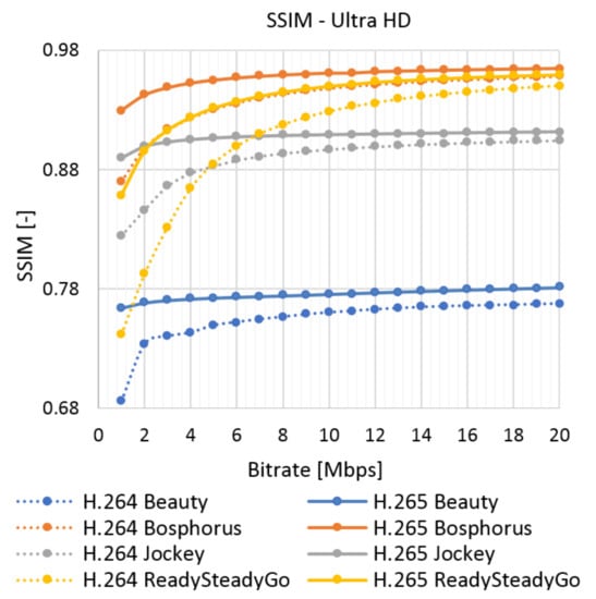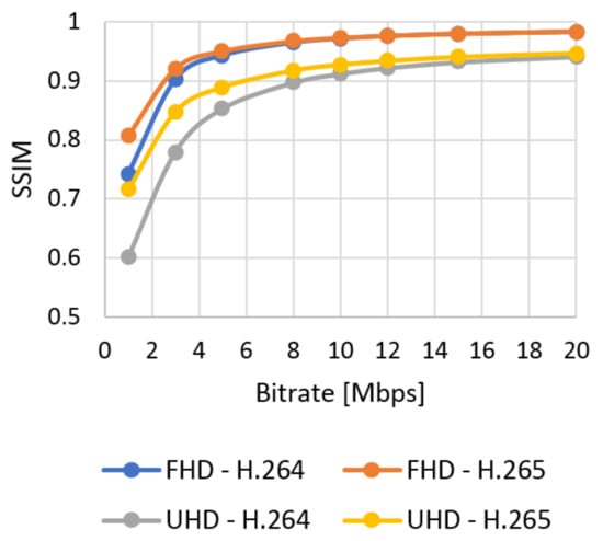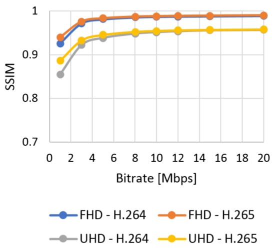 The results of the objective assessment using the SSIM metric for the UVG sequence are shown in Figure 9 for Full HD and in Figure 10 for Ultra HD resolution. The results for the chosen SJTU Media Lab video sequences are in Figures 12–15 in Section 7. The evaluated data are compared with the objective and subjective metric in the selected video.