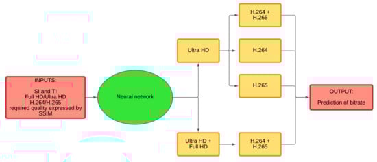 Training of the neural network can be more effective if inputs and outputs are done by scaling in the same interval. We tested scaling at <−1; 1> and <0; 1> intervals (we also tested training without scaling inputs and outputs). Network training was done separately for the H.264 and H.265 codecs and both codecs at once, which made it possible to compare network training for two different input groups.
