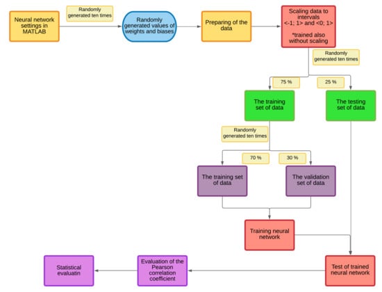 We trained the neural network ten times for each topology for more accurate results. Weights and biases were always randomly generated. This has limited the impact of randomly generated initialization weights, which has increased the statistical significance of the whole process. A validation set of data was used during training to verify the rightness of the network training to prevent it from being overloaded. Training and testing sets were created from the database. It was a random choice into 75:25 for training:testing. After that, the validation set was generated from the training database at a ratio of 70:30 for the training set. This process was repeated ten times to guarantee statistical significance. Each repetition trained the network with different training and validation sets. The training was performed for multiple topologies that contained two, three, and four layers of concealed neurons, with up to 160 neurons in one layer. The network was overburdened with a higher number of layers; a higher number of neurons in one layer was not necessary, as the network was able to properly train with fewer neurons, which demonstrates the results of the simulation. The ratio of data distribution, number of layers, number of neurons resulting from training, and simulation tests show the results of the final programmed algorithm and the results obtained by looking for the proper functions and selecting the correct data layout. The number of repeats chosen was also based on the results of the authors [].