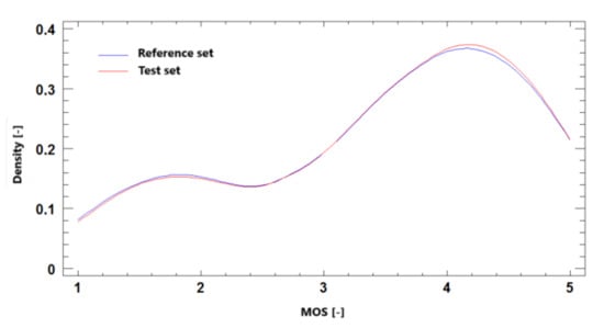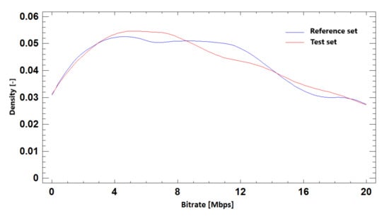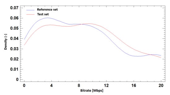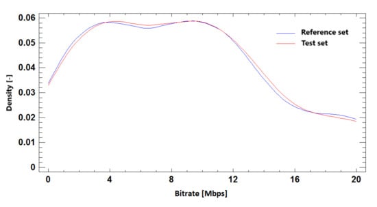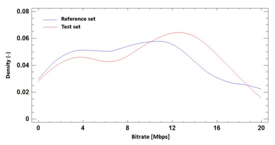Distribution density trace also shows the similarity of reference and test sets for bitrate prediction based on MOS for Ultra HD resolution in Figure 27 and also for Full HD and Ultra HD resolution Figure 28.