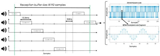 As mentioned, the LOCATE-US system allows the flexible configuration of US transmissions in terms of the signals to be transmitted, simultaneous or sequential emission, frequencies used and size of the acquisition buffer. All these parameters have to be set for the algorithms that run in the portable device. For clarity’s sake, considering the characteristics of the building in the tests [30], Kasami codes [38] with a length L = 255 bits were modulated following a Binary Phase Shift Keying (BPSK) scheme with Nc = 2 periods of a sine carrier at fe = 41.67 kHz. Signals are converted at a sampling rate of fse = 500 kHz and fed into the US beacons. Kasami codes provide a suitable performance in TDOA acoustic local positioning systems, due to their low cross-correlation lobes if compared with other traditional pseudorandom codes [16,19,38]. Note that a hyperbolic TDOA positioning algorithm is considered due to the lack of synchronism between the beacons and the receiver. Besides the encoding, the results can be improved if a Time-Code Division Multiple Access (T-CDMA) is considered, where every beacon emits consecutively in a different time slot, as shown in Figure 4. Finally, it is worth mentioning that Kasami sequences and BPSK modulation have already been proven to perform suitably in a US positioning system with such bandwidth constraints, although other approaches are also feasible, such as Zadoff-Chu codes with an Orthogonal Frequency Division Multiplexing (OFDM) technique [39].
