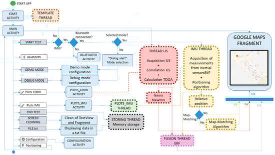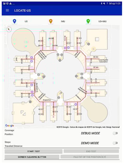 A START TEST button in the Main Activity launches the position estimation. The US Thread is in charge of processing the US signals and computes the GN algorithm. Correlations are carried out by performing an Inverse Fast Fourier Transform (IFFT) of the product between the acquired US signal and the complex conjugate of the stored modulated code patterns. On the other hand, to make use of the IMU, the user must activate this option by allowing its Bluetooth connection (Bluetooth Activity in Figure 12). Both threads, IMU and US, run in parallel. The Fusion Thread computes the EKF with the information provided by both sensors. Then, if graph-matching is allowed (in the current application the graph-matching is manually activated by the App designer), the GM Thread matches up the estimate with the corresponding position in the graph. Note that, since US signals provide a more accurate positioning than graph-matching, they are prioritized in the position estimation. Finally, the position is represented in real time in the device screen by using the Indoor Google Maps application programming interface in a new frame inside the main activity. All the trajectory is stored and represented in the screen since the user presses the START TEST option. In order to clean the markers from the trajectory, there is a SCREEN CLEANING button. Furthermore, END TEST allows the application to be finished and the FILE.txt option saves the positioning results in a TXT file.