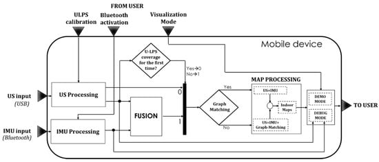 Figure 6 summarizes the tasks implemented by the mobile device application. In general terms, US and IMU signals are processed in parallel. The first time that the ultrasonic measurements are obtained, the position is estimated directly by the US Processing block, based on a Gauss-Newton algorithm (GN). Afterwards, the FUSION block merges the US results with the IMU measurements. If the U-LPS coverage is not available, only IMU measurements are considered for the positioning. Graph-matching can be optionally included to match the estimated position to the closest one in the model graph. The obtained position is displayed on the device screen by using the Google Indoor Maps API [3]. The user can choose between normal or debug mode. The correlation results from the US signals and the inertial sensor information can be plotted in run time. Hereinafter, the main algorithms used for the US, IMU and Graph-Matching blocks are detailed, whereas their adaptation to the device app is addressed in Section 4.