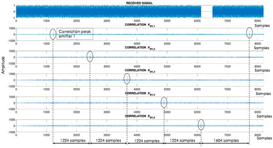 For the sake of clarity, an example of correlation results corresponding to the first U-LPS (U-LPS1) is shown in Figure 8 for a simulated situation, where the receiver’s position is equidistant to all emitters (TDOA is zero in all combinations). Considering the receiver sampling frequency fsr = 100 kHz and the T-CDMA scheme described in Section 2.1, every beacon correlation peak is separated M·L·fsr/fe = 1224 samples from the adjacent one, except for the reception from the beacons B1,5 and B1,1 that are separated 6·M·L·fsr/fe + TG·fsr = 1604 samples. The reference beacon for the TDOA estimation is the one received with the highest energy, which usually is the one closest to the receiver, thus providing a better time-of-arrival (ToA) estimation. It is worth mentioning that this approach is based on a LOS (Line-Of-Sight) situation, where the direct path is the one with most energy. If one or more of the direct paths are occluded, these measurements are not available at this moment and they are not included in the fusion filter. Intermediate situations (multipath) provoke errors that are reduced after successive measurements by the fusion filter.