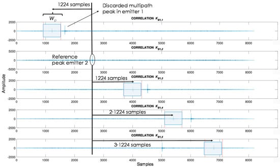 Considering the U-LPS coverage area and the beacon distribution, the distance between the reception of the closest beacon and the farthest one cannot be longer than 1 m (300 samples). Thus, those correlation peaks that occur outside the expected zone are discarded. After the higher correlation peak is detected, those corresponding to the other beacons are searched within a window of Wp = 600 samples (±300 samples, before and after the ideal correlation peak, to guarantee the suitable identification of all the correlation peaks) around their corresponding ideal arrival for TDOA = 0. Figure 9 depicts an example where the receiver is placed under beacon B1,2, which is the beacon received with most energy and considered as a reference for searching the remaining beacon peaks. The analysis window Wp is shadowed in blue. Note that beacon B1,1 presents a high correlation peak due to a multipath that is not selected for TDOA computation, since it appears outside the analysis window. This dynamic filter significantly reduces wrong estimations because the multipath. Also, a threshold is included to avoid the validation of noise as a correlation peak. If a beacon is not detected, the position is computed with the other four beacons, which are enough for 2-D hyperbolic trilateration. If more than one beacon is missed, the ultrasonic measurements for that acquisition are discarded.