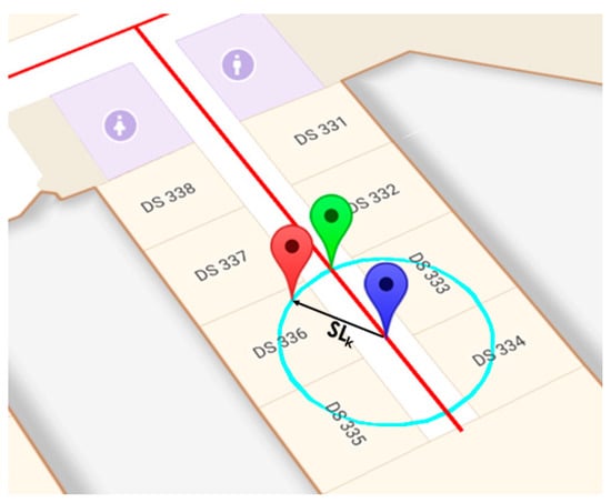Map information can also be included by means of Graph-Matching (GM) indoor localization. The aim is to prevent from situations that are not coherent, such as crossing walls, as well as to further reduce the number of U-LPS to be deployed if covering an extensive indoor area. Nevertheless, the U-LPS unit is still required in critical points, such as entrances, exits or corridor crosses, to obtain a decimeter absolute position that corrects the drift errors from the IMU, which may have led to a position in the graph far away from the actual one. The algorithm used for graph-matching consists in a geometrical estimation that matches up the estimated position from the previous stages with the position in the graph that provides the lowest error. Starting from a previously known position, the next position is obtained by drawing a circle with a radius equal to the width of the step length SLk and by calculating the intersections with the line defined in the graph. After the intersections are obtained, the new mobile device position is the one with the shortest Euclidian distance to the original estimated position (see Figure 11 for an example and [46] for more information).