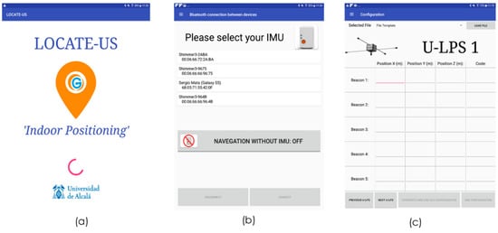 Screens from LOCATE-US application. (a) Welcoming screen, (b) Bluetooth IMU activation screen, (c) U-LPS configuration screen.