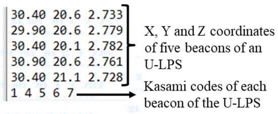 where is the Euclidean distance between the a priori position estimation and the beacon of the U-LPS; and are the coordinates of the beacon used as reference.