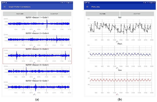 If the DEBUG mode is selected, the user can see some useful data in run time. Figure 16a shows the correlation results in case of U-LPS coverage. The screen indicates the number of U-LPS from which the US signals are received (for practical issues, hereinafter, we have used letters instead of numbers to encode the different deployed U-LPSs, from A to K, instead of from 1 to 16). In Figure 16a the detected U-LPS is the F and the codes assigned to each beacon are 1, 4, 5, 6 and 7. It also highlights with a red box the beacon received with most energy, which is the one considered as reference in the TDOA computing. The buttons “PLOT CORR” and “CLEAR CORR” allow the correlation representation and the graphs to be cleared from the screen, respectively. On the other hand, Figure 16b allows the representation of the Euler angles from the IMU in real time, through the button “PLOT IMU”.