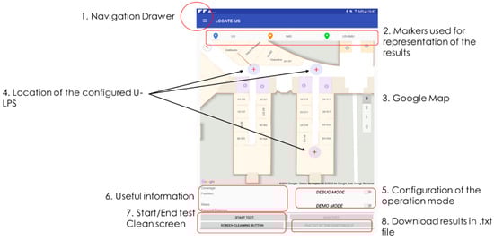 The Main Screen is shown in Figure 17. The button labelled as “1” opens a navigation drawer that allows the Bluetooth activation, U-LPS configuration and the visualization of the IMU and correlations. In “2” a legend appears with the markers used for the positioning results: in blue the coordinates obtained only with US measurements, in orange those obtained with the IMU, and in green the ones obtained after the sensor fusion and the application of the graph-matching algorithm if it is internally enabled by the designer. Note that in DEMO mode the results shown only correspond to those after the fusion (green mark). In “3” there is a section of the Google indoor map where the mobile device is around (it also considers the building floor). The U-LPS locations are indicated by a red cross, and their coverage area is represented by a grey circle, as shown in “4”. The operation mode is specified by two switches in “5”. Some useful information is available in “6”: if there is US coverage, it is indicated and the number of U-LPS is shown in the screen, the user’s position coordinates are also depicted, together with the number of steps since the test was initiated and the travelled distance in meters. Below (in “7”) the user can start or end the specific test, and also clean the screen (all positioning markers will be deleted). Finally, the positioning data can be downloaded into a txt file through the option indicated in “8”.