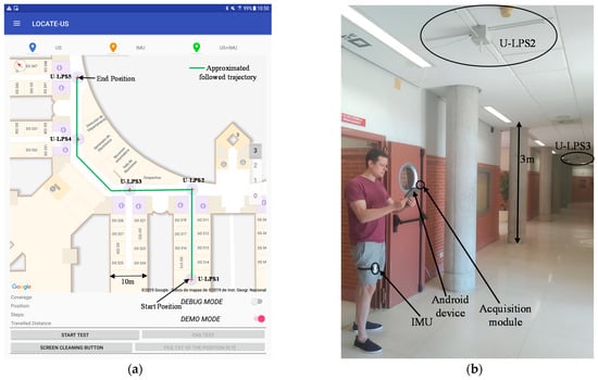 The experimental tests were carried out in the School of Engineering from the University of Alcala. The positioning infrastructure was composed of five U-LPSs placed on the ceiling (around 3 m of height) at several strategic positions (one in a laboratory and the others in corridor crosses), in order to cover a distance of 57 m approximately. Figure 18a shows the indoor map with the U-LPS positions and the trajectory followed by the user. Figure 18b is an image in one spot of the trajectory where a person equipped with a tablet was located; it includes the acquisition module described in Section 2.1, and the IMU from Section 2.2 was placed outside the pocket of the user. All the installation processes were carried out and measured manually, and no calibration stage was involved. The US beacons’ positions were known (from previous tests) and the IMU was put with one axis pointing up and other pointing to the front of the person.