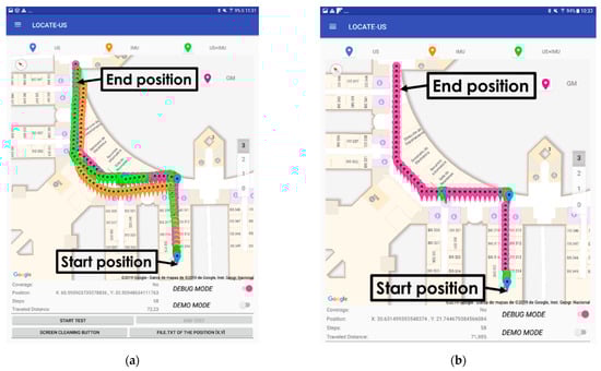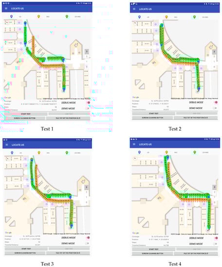 The test trajectory was followed by a person with all the devices four times, following the trajectories on the floor carefully at a constant speed (normal walk), to observe the consistency of the results (no more repetitions were necessary to reach a conclusion). The map of the building could be referenced to local or universal coordinates. Figure 19 shows the visual results as screenshots of the Android device, without the use of graph-matching.
