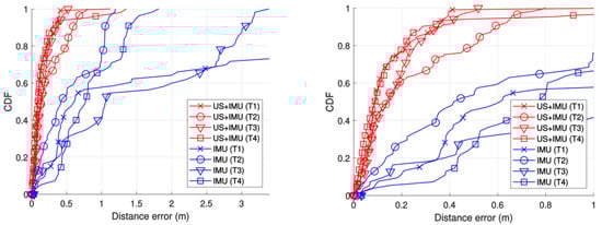 Figure 20 shows a Cumulative Distribution Function (CDF) of the errors in distance between each estimated position and the approximate ground truth marked around the center of the corridors. The red lines are the results of the US and IMU fusions for the four experimental tests, and the blue lines are the results when using only the information provided by the IMU.