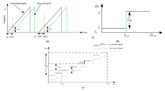 Range and velocity estimation schemes. (a) linear frequency modulated continuous waveform (LFMCW) scheme [52], (b) Frequency Shift Keying (FSK) waveform scheme [67], and (c) Multiple Frequency Shift Keying (MFSK) waveform system [68].