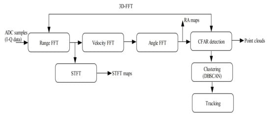The complete procedure is depicted in Figure 2, which consists of seven functional processing blocks. A fast Fourier transform is usually conducted over the 3D tensor to resolve the object range, velocity, and angle. In the beginning, the received radar signals (ADC samples) within a single coherent processing interval (CPI) are stored in matrix frames creating a 3D radar cube with three different dimensions, including fast time (chirp index), slow time (chirp sampling), and the phase dimension (TX/RX antenna pairs). Then, an unambiguous range–velocity estimation is the second processing stage, which is achieved via a 2D-FFT processing scheme on the 3D radar cube. Usually, the range FFT is first executed on an ADC time–domain signal to estimate the range. The second FFT (velocity FFT) is then performed across the chirps to estimate the relative radial velocity.