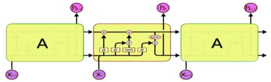 As shown in Figure 5, LSTM has a chain-like structure, with repeated neural network blocks (yellow rectangles) having different structures. The neural network blocks are also called memory blocks or cells. Each cell accepts input at a time and output , called the hidden state. Then two states are transferred to the next cell—namely, the cell state and the hidden state. These cells are responsible for remembering what is performed inside them while their manipulations are performed using gates (i.e., input gate, forget gate, and output gate) [95]. The input gate adds the information to the cell state. A forget gate is used to remove information from the cell state, while the output gate is responsible for creating a vector by applying a function () to the cell state and uses filters to regulate them before sending the output.