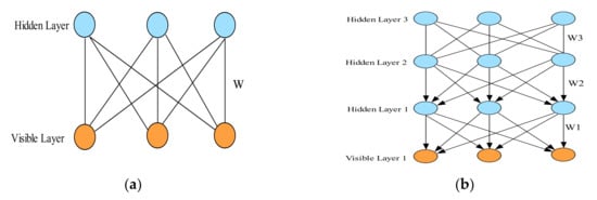 Restricted Boltzmann Machine (RBM) has received increasing consideration over the recent years, as they have been adopted as the essential building components of deep belief networks (DBN) [101]. They are a specialized Boltzmann Machine (BM) with an added restriction of discarding all the connections within each visible or hidden layer, as shown in Figure 8a. Thus, the model is described as a bipartite graph. Therefore, an RBM can be described as a probabilistic model consisting of a visible layer (units) and a hidden layer (units) that extract a given data’s joint probability [102]. The two layers are connected using symmetrically undirected weights, while there are no intra-connections within either of the layers. The visible layer describes the input data (observable data) whose probability distribution is expected to be determined, while, on the other hand, the hidden layers are trained and expected to learn higher-order representations from the visible units.
