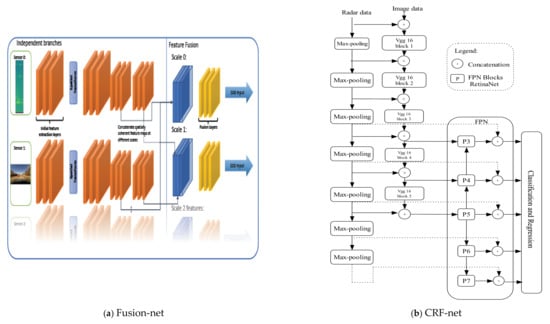 Multi-sensor fusion refers to the technique of combining different pieces of information from multiple sensors to acquire better accuracy and performance that cannot be attained using either one of the sensors alone. Readers can refer to [19,20,21,22] for detailed discussions about multi-sensor fusion and related problems. Based on the conventional fusion algorithms using radar and vision data, a radar sensor is mostly used to make an initial prediction of objects in the surroundings with bounding boxes drawn around them for later use. Then, machine learning or deep learning algorithms are applied to the bounding boxes over the vision data to confirm and validate the presence of earlier radar detections [23,24,25,26,27,28]. Moreover, other fusion methods integrate both radar and vision detections using probabilistic tracking algorithms such as the Kalman filter [29] or particle filter [30], and then track the final fused results appropriately.