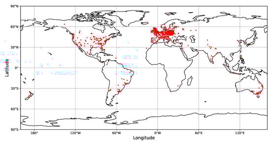 In 1912, Victor Hess conducted a series of balloon experiments, revealing that the electric conductivity of the atmosphere increases with the elevation above the sea level. He boldly conjectured that the effect was due to the interaction of the atmosphere with the corpuscular charged particle radiation of extraterrestrial origin. More than 100 years after the discovery, due to their still undetermined origin, cosmic rays are being actively studied by astrophysicists. Further areas of interest include their implications for radiative safety [], operation of electronic devices working both on Earth and in space [,], or even the earthquake prediction [,,]. Of the several types of cosmic ray detectors [,], we focused on the semiconductor detectors []. Originally, they were conceived for measurements of particle energies, but with multi-sensor arrays equipped with many thousands of read-out channels and up to several hundred square meters of surface coverage, they became primarily used for particle tracking in nuclear and high-energy physics experiments []. Due to their low energy threshold, they also found applications beyond physical research, e.g., in medical imaging []. Notwithstanding their large number of applications, the basic physical processes upon which all semiconductor sensors are based are the same. Notably, the same physical processes are used in CMOS sensors applied in domestic electronic devices like video recorders or digital cameras used by mobile phones. The cameras of mobile phones are of particular interest for cosmic ray detection due to these devices’ ubiquity and network connectivity. Combining these features makes the mobile phones an ideal framework for creating the global network of radiation detectors coupled to central data storage. This idea underpinned several particle detection initiatives like CRAYFIS [,,,,], DECO [,,,], and CREDO [,]. The analysis presented in this paper is based on the CREDO detection data set, as this is currently the largest publicly available data set of particle images obtained with mobile phones. The range of the CREDO worldwide device infrastructure is shown in Figure 1. Currently, the total number of registering devices is over 10,000 and is increasing.