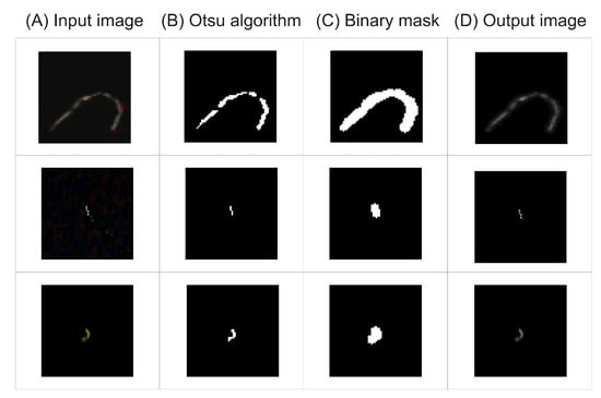 - An object of interest is detected by maximizing the separability of the resultant classes in gray levels using an Otsu algorithm [] (Figure 3B). The result is stored in binary mask.