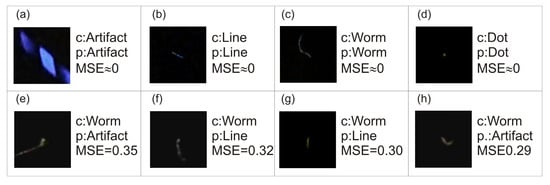 As shown in Section 3, the proposed deep convolutional neural network architecture is capable of approximating uncertain class assignments that were performed manually by a group of judges. There are two measures we used to evaluate our solution: RR and MSE. Although there are a large number of trainable parameters in classification layers, the high recognition rate evaluated in 10-fold cross-validation assures that the network was not overtrained and still has generalization ability. All convolutional feature extractors have relatively small MSE, while VGG16 and DenseNet201 seem to be the best for the task. The value of MSE corresponds to the recognition rate of the network: the smaller the MSE, the better the recognition rate of the network. This is an important finding because it indicates that the uncertainty modelling of judges’ decisions was correctly designed (Table 2). The training of the proposed architecture is stable and follows expectations. The lowering of the learning rate value stabilizes the variation in the loss functions and slightly decreases the MSE (Figure 4). Lowering the learning rate after a certain number of iterations of the gradient-descent method lowers the influence of the gradient on the final solution. This allows for a better adjustment of the solution to the local minimum. According to confusion matrices presented in Table 3, Table 4, Table 5, Table 6 and Table 7, the artefact class was the easiest to recognize. This is probably because those images differ the most from other classes despite artefacts potentially having various forms. The second easiest to classify object was spots because spots are among the best-defined potential shapes that can be found in the data set. The next two classes, track and worm, were more problematic. These two classes are most often confused with each other due to the subjectivity of the judgement of specialists assigning images to those two classes. In case of the network using the VGG16 feature extractor, nearly 15.10% ± 9.01% of tracks were incorrectly assigned to the worm class, while 22.64% ± 10.70% of worms were incorrectly assigned as tracks. As shown in Figure 6, the difference between tracks and worms is very subjective: there is not much visible difference between a track (Figure 6b) and a worm (Figure 6g). It was difficult to guess the judges’ reasoning in this case. Worms were confused with artefacts: in case of VGG16, incorrect classification between those classes was 8.64% ± 4.19%. This situation was also caused by judges’ subjectivity. Due to the MSE being quite low, the proposed architecture correctly models the judges’ decision despite there only being five judges and the shape of the worm class was not clearly defined (see Section 2.3). There are two possible solutions to overcome this problem. The first is to increase the number of judges and to define each class more precisely; however, this does not guarantee improving the true positive rate of worm and track classes. The second possibility is to apply the threshold scheme (8). Application of this scheme involves a trade-off between the accuracy and the number of objects that can be classified. As shown in Table 8, Table 9 and Table 10, even the application of the lowest considered threshold improves the true positive rate of all classes (compare with Table 3). For example, the true positive rate of the worm classes improved from 62.59% ± 9.9% to 75.87% ± 13.51% when , to 79.54% ± 10.97% when , and to 89.65% ± 15.52% when . This operation, however, results in 56.98% ± 16.92%, 34.71% ± 7.93%, and 18.445% ± 7.22% of worms being appropriately classified, respectively. Due to this finding, threshold t has to be chosen carefully, considering many factors of certain detection. At this moment, it is difficult to compare our results directly with those from Winter et al. [], mainly because the DECO dataset is not publicly available; however, the accuracy of the results we obtained is very similar to those previously reported: spots 98.9% (our result from Table 10 is 98.7%), tracks 95.4% (ours: 88.9%), worms 92.9% (ours: 90.0%), and artefacts 98.2% (ours: 97.7%). Notably, we did not exclude any object either from the training or validation dataset due to labeling disagreement between judges, as was performed for the DECO dataset. Certainly, the image quality and the labelling process of the dataset have considerable impacts on the results of a method. In our case, we used approximation rather than a classification approach in DNN training, which seems to be reasonable with the presence of uncertainty in class assigning. Based on our experience, we think that unless some standardized approach to class assigning is established, uncertainties are inevitable. Therefore, the classification model should not only be able to deal with them but also take advantages of them, as does our proposed method.