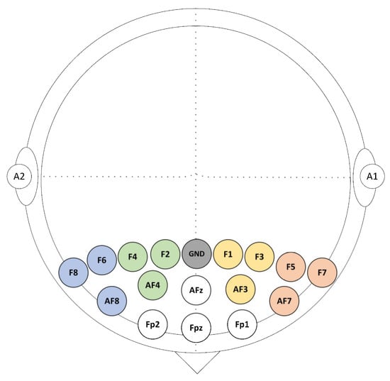 EEG data were acquired from a total of 16 gold electrodes at a rate of 256 Hz using BrainMaster Discovery amplifier (BrainMaster Technologies Inc., Bedford, USA). These electrodes were placed on the participants’ frontal cortex at the following locations: Fz, Fp1, Fp2, AFz, AF3, AF4, AF7, AF8, F1, F2, F3, F4, F5, F6, F7, and F8 according to the 10/10 system. All electrodes were grounded at the Fz and referenced to the linked earlobes as highlighted in Figure 2. The electrodes’ impedances were kept underneath 5 kΩ to ensure high-quality EEG recordings. The event trigger signals obtained were sent from the parallel port of the computer accessed by MATLAB to the EEG amplifier and recorded on an event channel to synchronize the presentation of tasks and the recordings of EEG data.