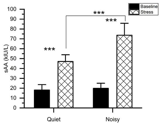 Mean activity of salivary alpha-amylase for stress and baseline at quiet and noisy workplaces. The error bars indicate the standard deviations and the stars indicate the significant differences (*** p < 0.001).